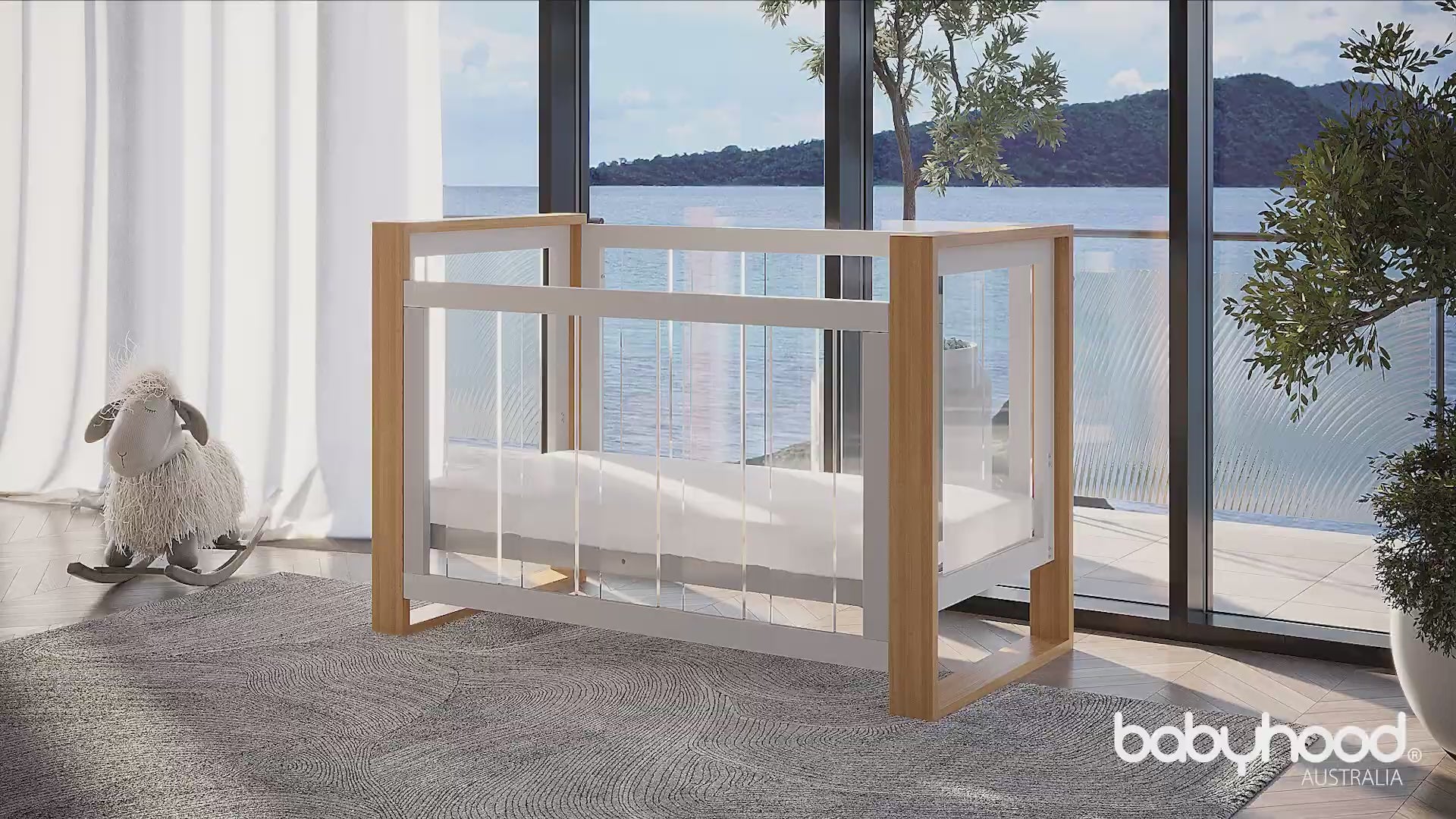 The Bella Cot makes your precious baby the star of the nursery as the cot is designed with acrylic panels to showcase your baby and is framed with a modern European beechwood accent on each end.